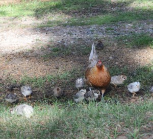 We have another breed of chickens on the homestead — ‘Silver Phoenix’, a heritage breed. These chicken forage for their feed, roost in trees at night and give us a nice pink, medium size egg. These are the eggs we use at home, while we sell the large and extra large eggs from the layer breeds to our customers. This will be the last year that we raise laying hens. The Phoenix chickens provide us with all the eggs we need for home use without the high feed inputs of a laying breed. They hide in the woods for 21 days and emerge with a clutch of 8 to 12 chicks, which they raise themselves. We take the cockerels for the freezer at 5 months — when we can catch them. The feed inputs are minimal on heritage chickens and ours lay year round.
