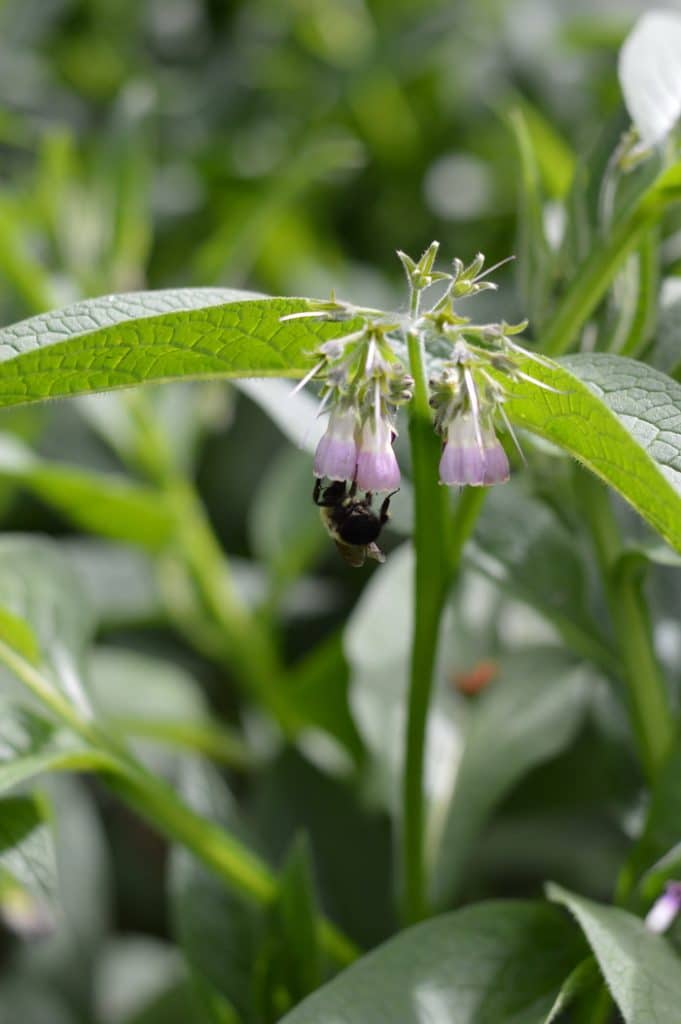 - Comfrey should be planted outside the vegetable garden in a spot reserved for it. It spreads through root pieces and will shade other plants if planted directly in the garden. It is beneficial as a cut and come again mulch, as it bioaccumulates minerals in it’s leaves that are beneficial to other plants. It can be cut back two or three times during the growing season. I like to leave a few comfrey plants to flower though, as it will flower continuously until frost giving nectar to bumble bees and other native pollinators.