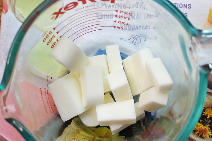 - Cut melt and pour soap into 1 inch cubes. Place in heat proof glass measuring cup. Add 2 tablespoons of frankincense infused oil. Microwave in 15 second bursts until the soap base melts. Do not overheat. Remove from microwave. Stir to ensure that the soap is fully melted.